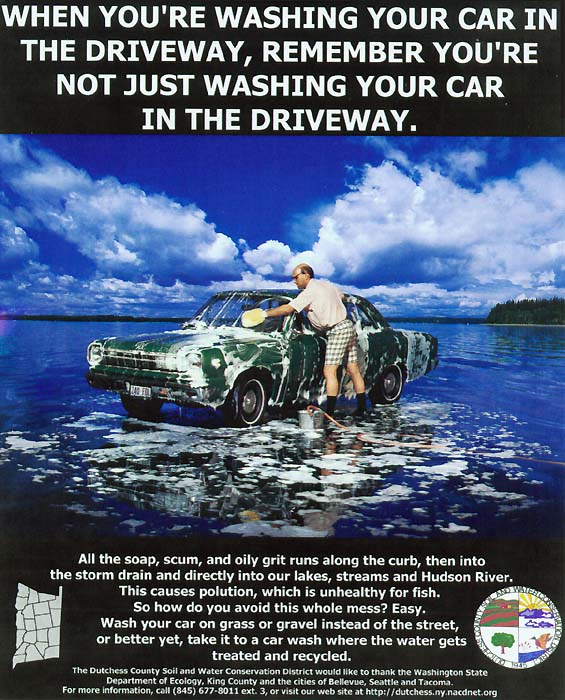 There's no problem with washing your car. It's just how and where you do it. Most soap contains phosphates and other chemicals that harm fish and water quality. The soap, together with the dirt and oil washed from your car, flows into nearby storm drains which run directly into lakes, rivers or marine waters without being treated first. The phosphates from the soap can cause excess algae to grow. Algae looks bad, smells bad, and harms water quality. As algae decays, the process uses up oxygen in the water that fish need.