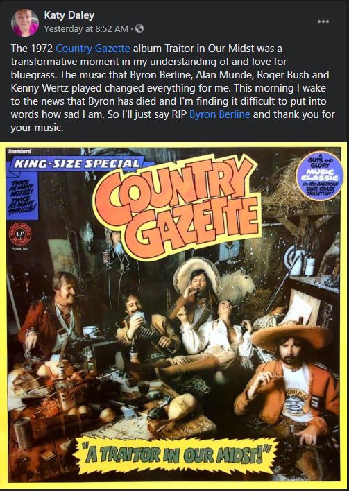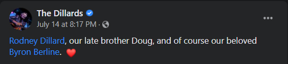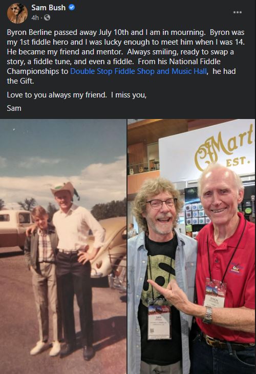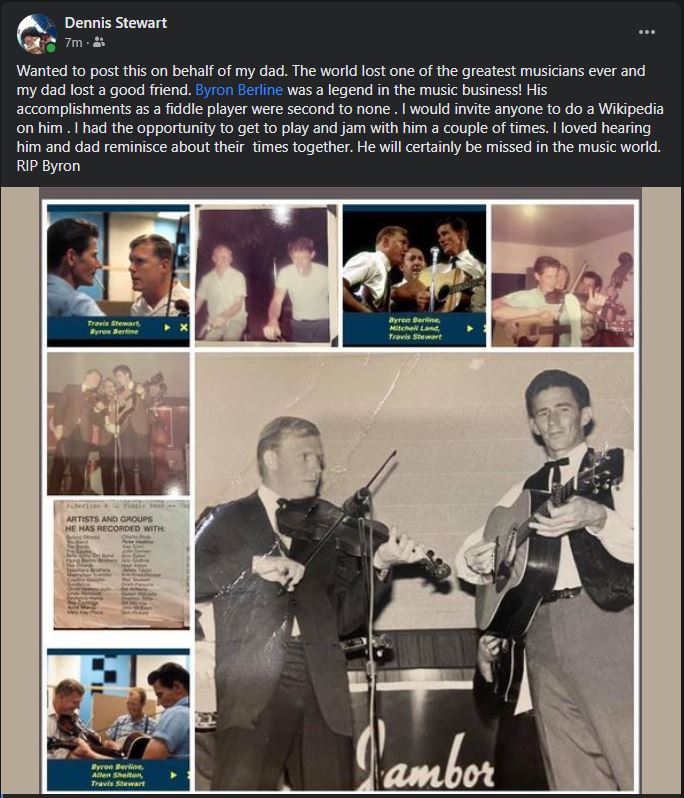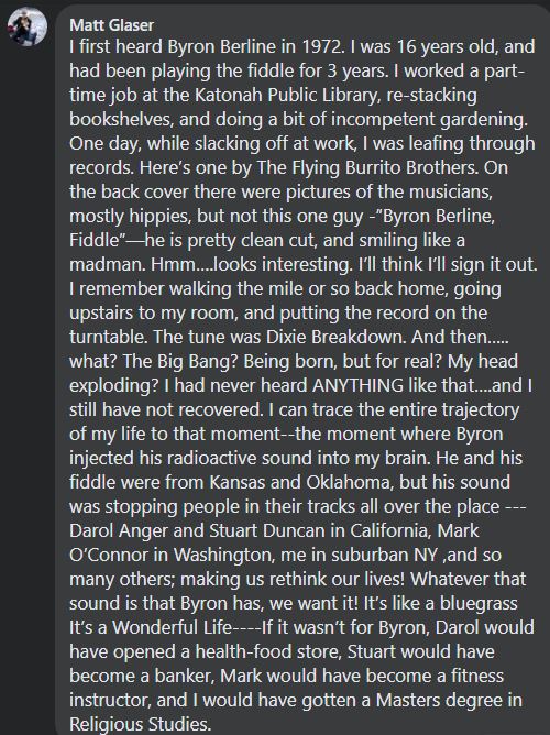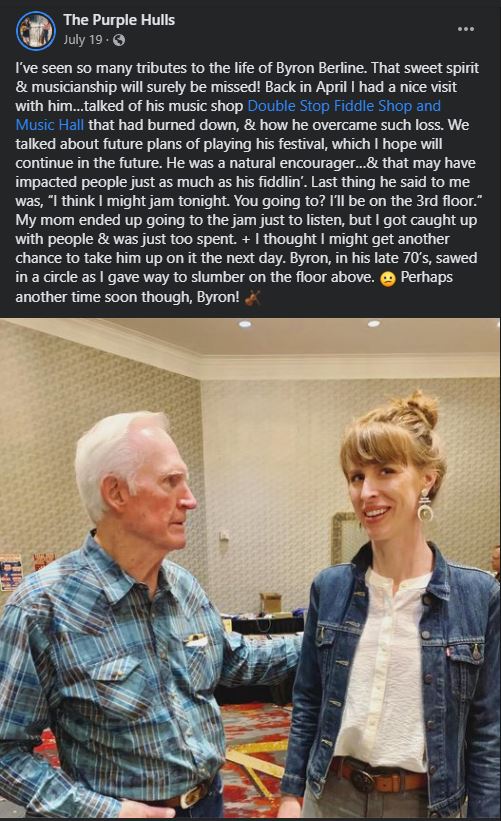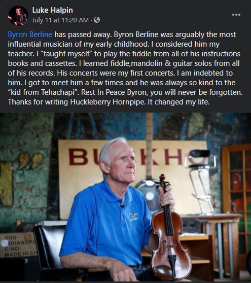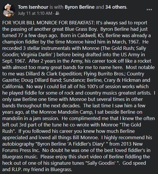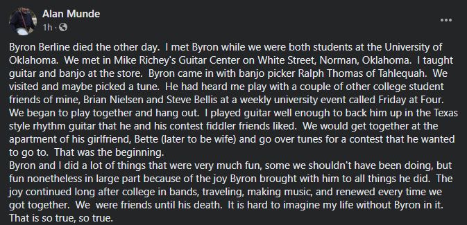 When his nephew Barry Patton called to tell me Byron had just had a stroke and was in the hospital, but that he was doing ok and was on the slow road to recovery, I never dreamed I was about to run out of time to see my old friend and just sit with him and be there for him as he did for me that night in his driveway so long ago. I started wrapping up some things at home and getting ready to make a run back to Oklahoma to see him. But Byron left us before I got there. I wanted to tell him how much he meant to me. to tell him that I knew how much he'd done for me and how he'd been a friend when I really needed one. And how nearly everything in my life today, from my wife and kids to my horse clinic business can be traced back to meeting Byron Berline 48 years ago. I didn't get to tell him, but I think he knew. So farewell my dear friend, and thank you from the bottom of my heart. I'll see you later.