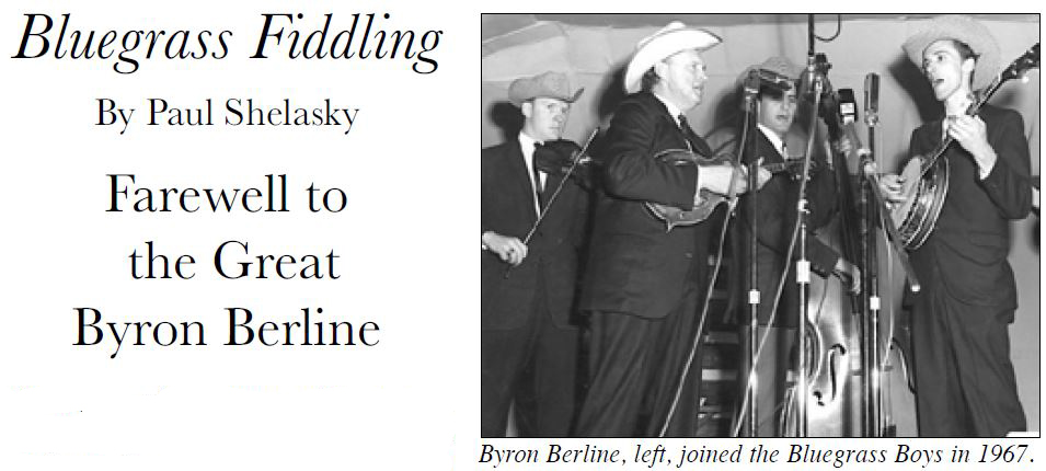 I travelled thousands of miles with Byron, roomed with him, wrote tunes with him, recorded with him, did workshops together with him, played countless shows with him. So many times we'd be playing a show somewhere and I'd be standing there with John Hickman on my right, Byron on my left, and Spurgin and Crary on down the line; and I'd look down that line at these guys and think "Man, I'm the luckiest guy in the world". As I stood there next to Byron while we played Sally Goodin' to wrap up the set, I'd watch him draw the bow across the strings, and he would make it sing like running your finger around the rim of a wine glass. The power in his bow arm would make the fiddle resonate to the point that the whole room would start resonating till it felt like the windows would shatter in the back of the hall.
