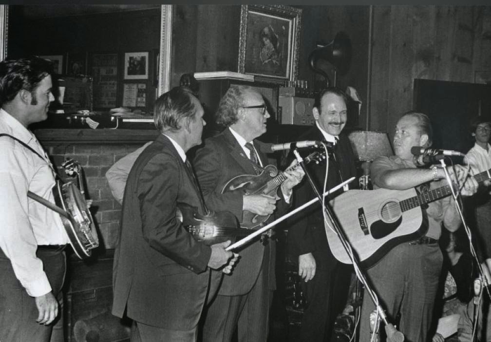 Alan Munde, Kenny Baker, ?-bass (hidden), Bill Monroe, Tex Logan, Jimmy Martin