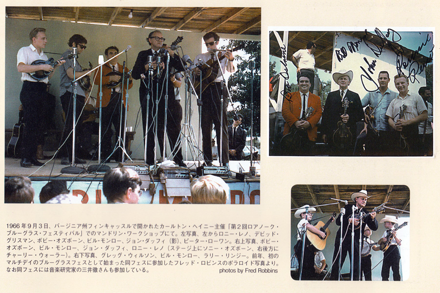 Upper Right: Bob Osborne, Bill Monroe, John Duffey, Ronnie Reno, (Sonny Osborne on stage, Charlie Waller far right)