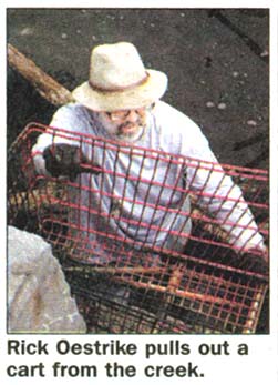 Rick Oestrike, chairman of the watershed committee, braved the murky water that went above his knee to fill a large plastic bag with debris.
